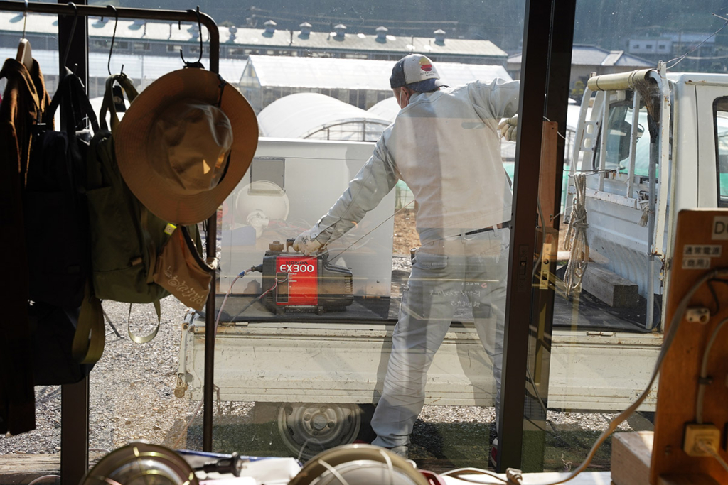 地震や台風などの災害時に役に立つ発電機。簡易的な照明だけでなく、配電の工事をお願いすれば、非常用電源に切り替えて普段に近い状態で使用できるようになるのだそう。