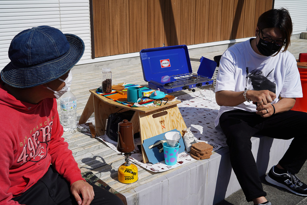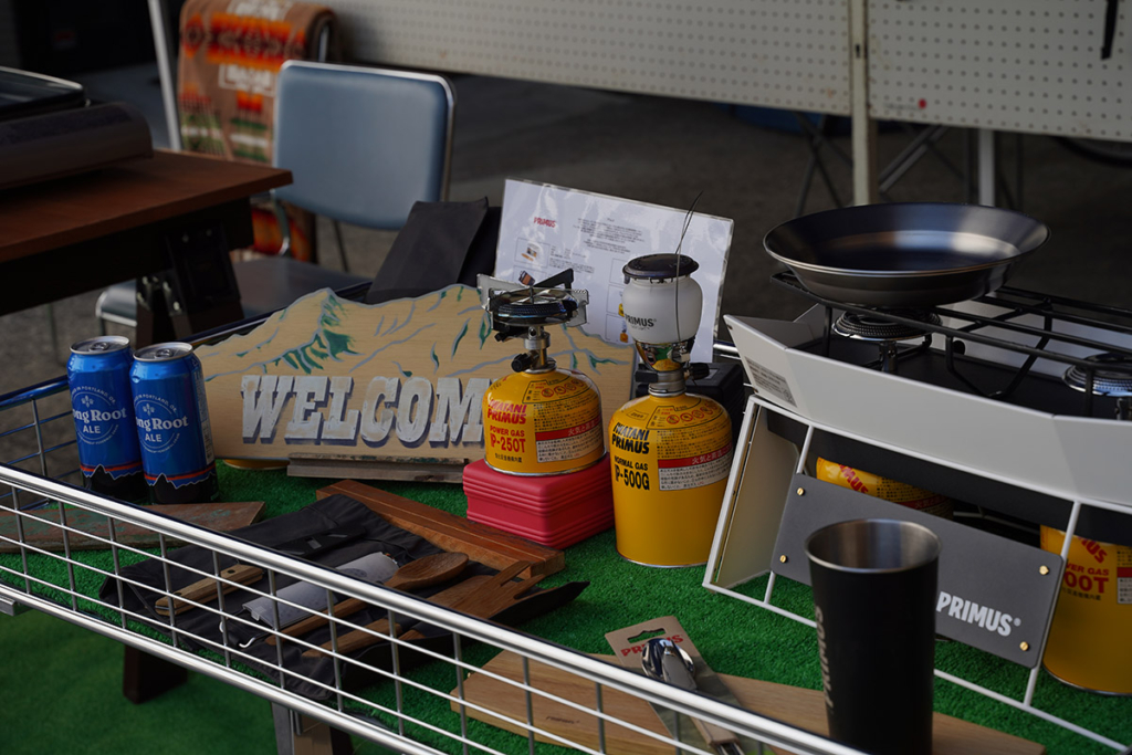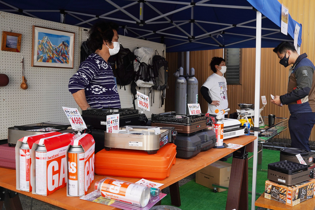 家庭で便利に使えるガス機器はもちろん、デザイン性・機能性ともによいアウトドアグッズが豊富に並びます。スタッフや地元の仲間たちが集まって和気あいあい、アットホームで賑やかな会場です。デイキャンプを楽しみながら。
