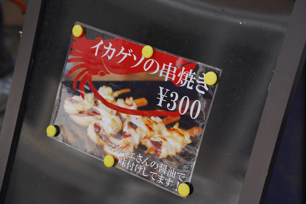 イカゲソの串焼きブースも登場。春の日差しの中、すっかりお祭りムード。辺りにいい香りが漂います。