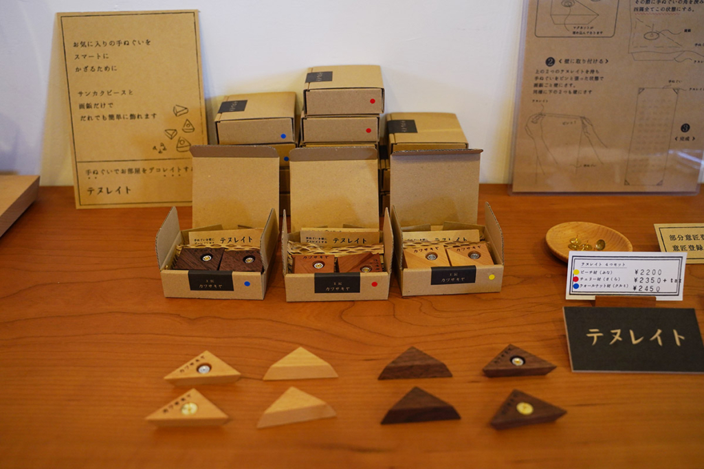お気に入りの手ぬぐいを飾るための『テヌレイト』。壁に画鋲を刺した後、マグネットで押さえるオリジナルの形状で布に穴を開けずに飾れます。