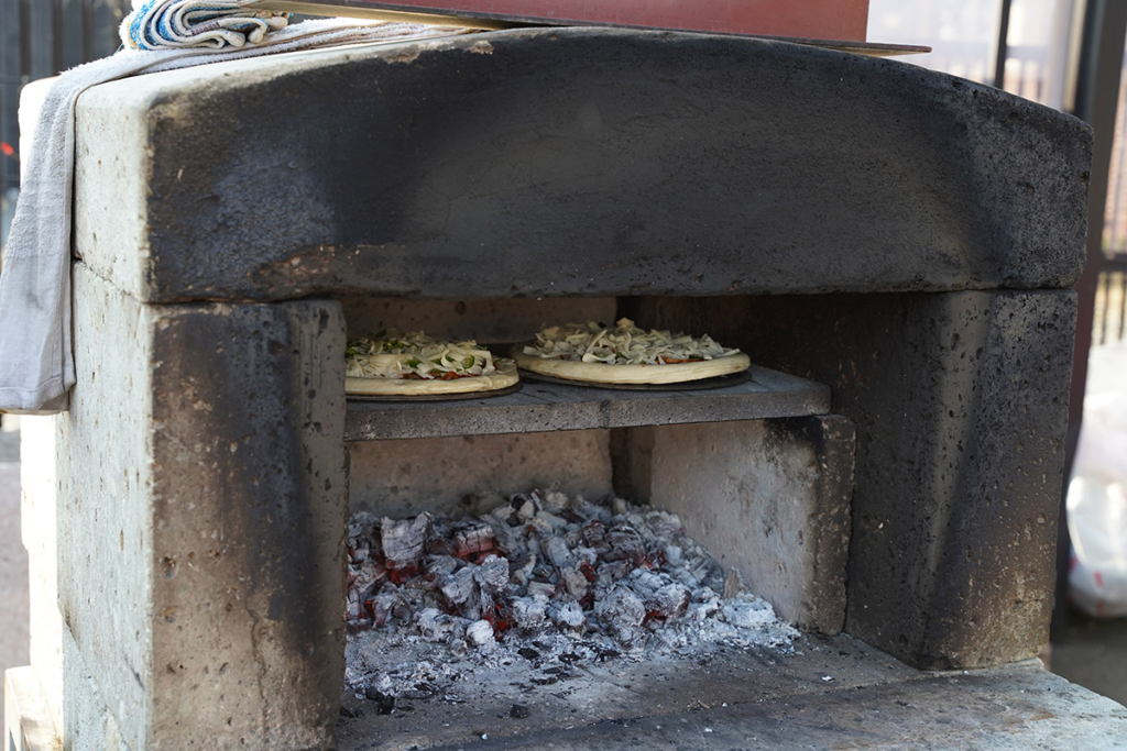 オリジナルで作ったこだわりの石窯。大谷石と溶岩プレートでできています。大谷石は割れにくい素材なのだそう。