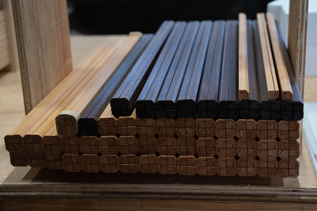 ショップの奥に隣接している工房も見学させていただきました。深みのある梁と土壁が美しい味わい深い工房です。1本1本丁寧に削り出された『ポストレイト』も工房に整然と並んでいました。