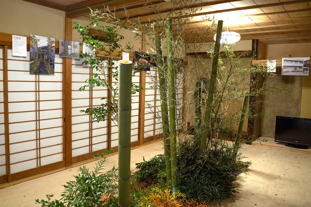 過去の施工案件の紹介パネルの展示。様々な環境で植栽を楽しむイメージが具体的になります。